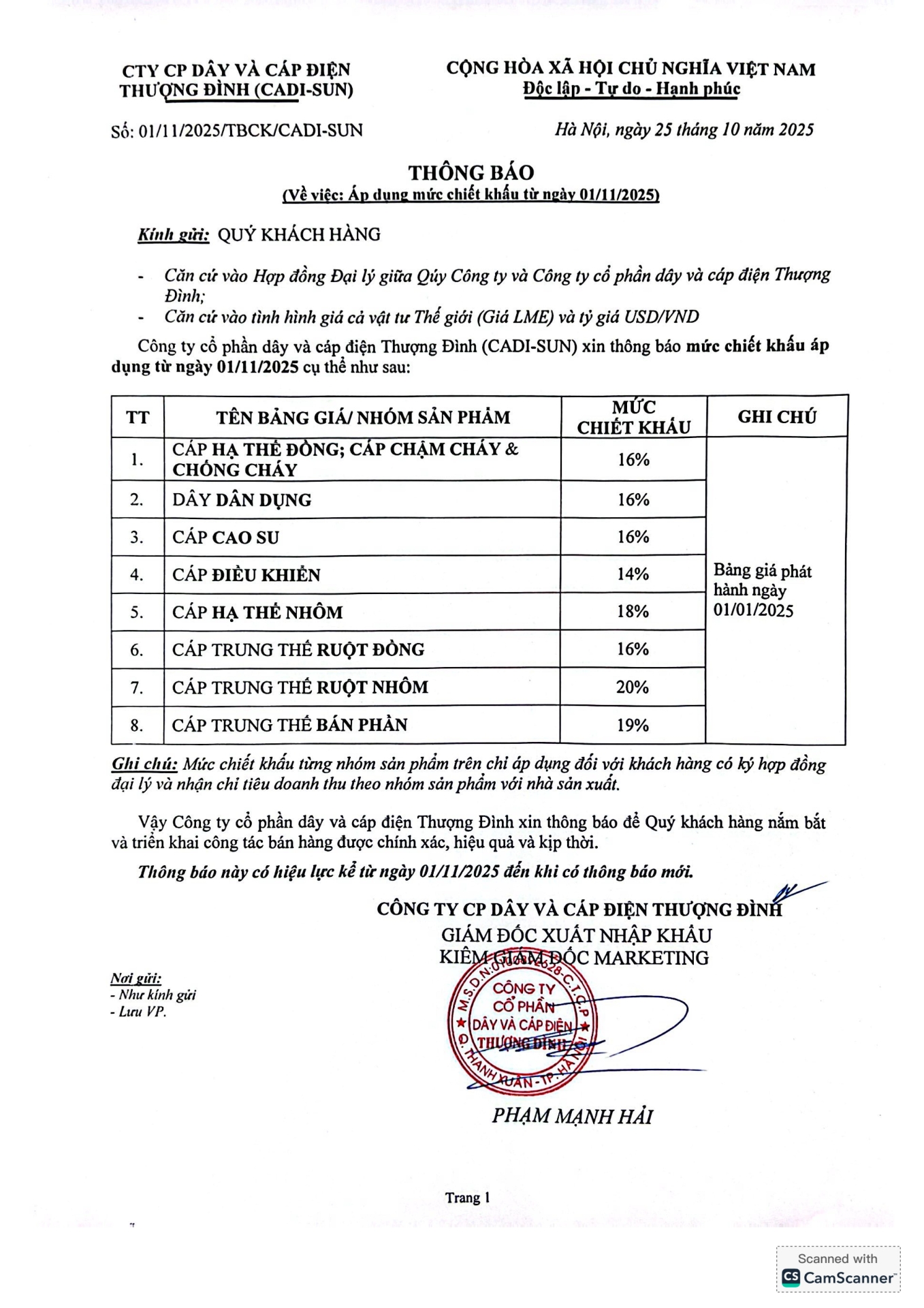 Cadisun thay đổi chiết khấu áp dụng từ 1/11/2025