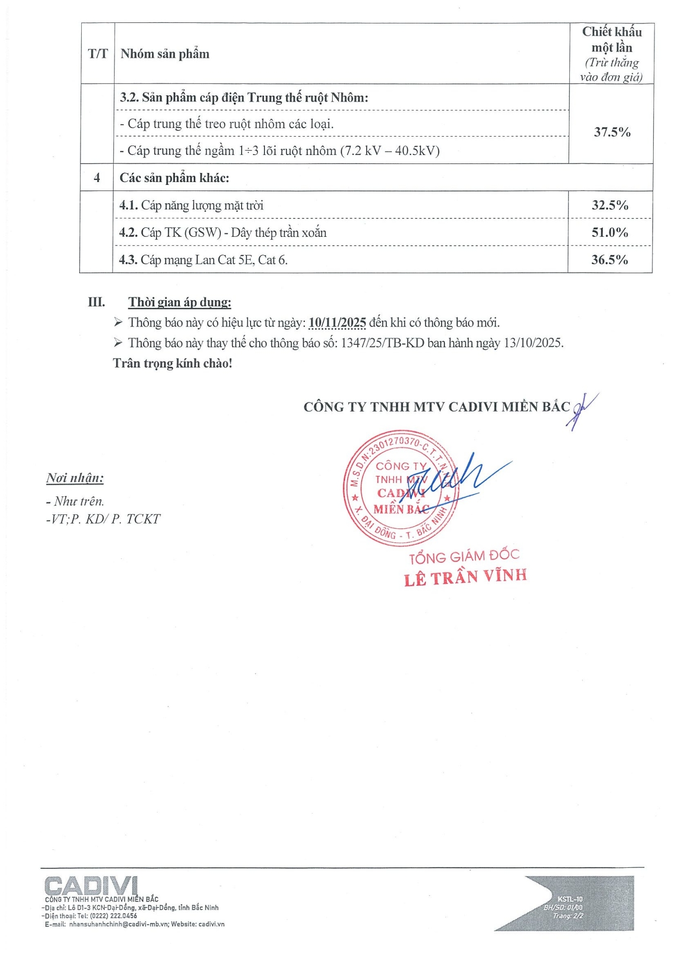 Cadivi miền Bắc thay đổi chiết khấu áp dụng từ 10/11/2025